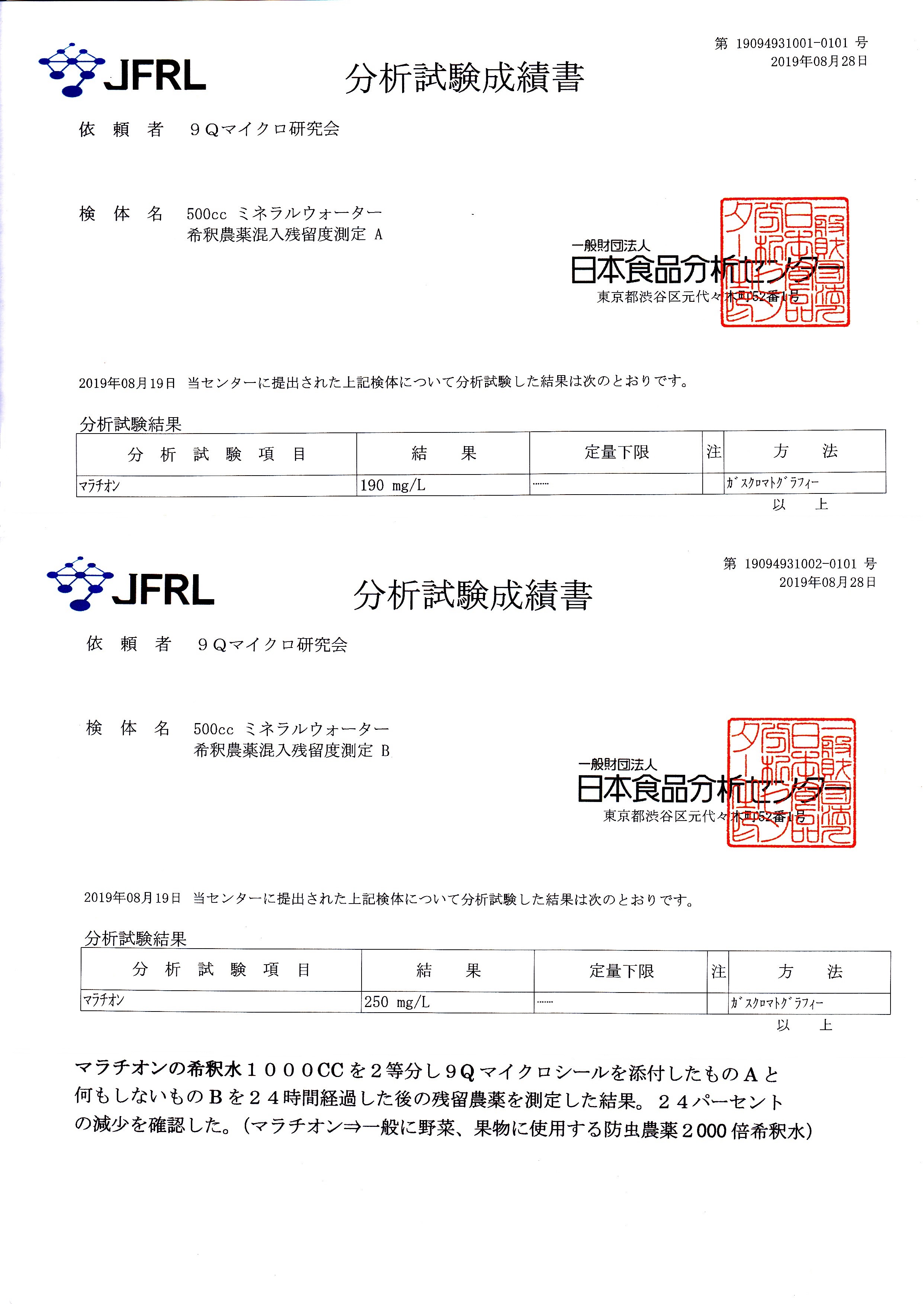 また、農薬希釈水容器の外側に9Qマイクロシールを貼付たところ、農薬値の低減が確認されました。