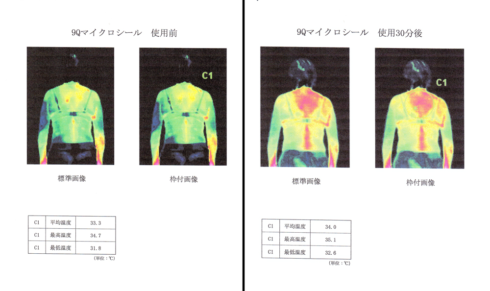 9Qマイクロシールは、身体に貼ることで体温が上昇するといった効果も確認されています。